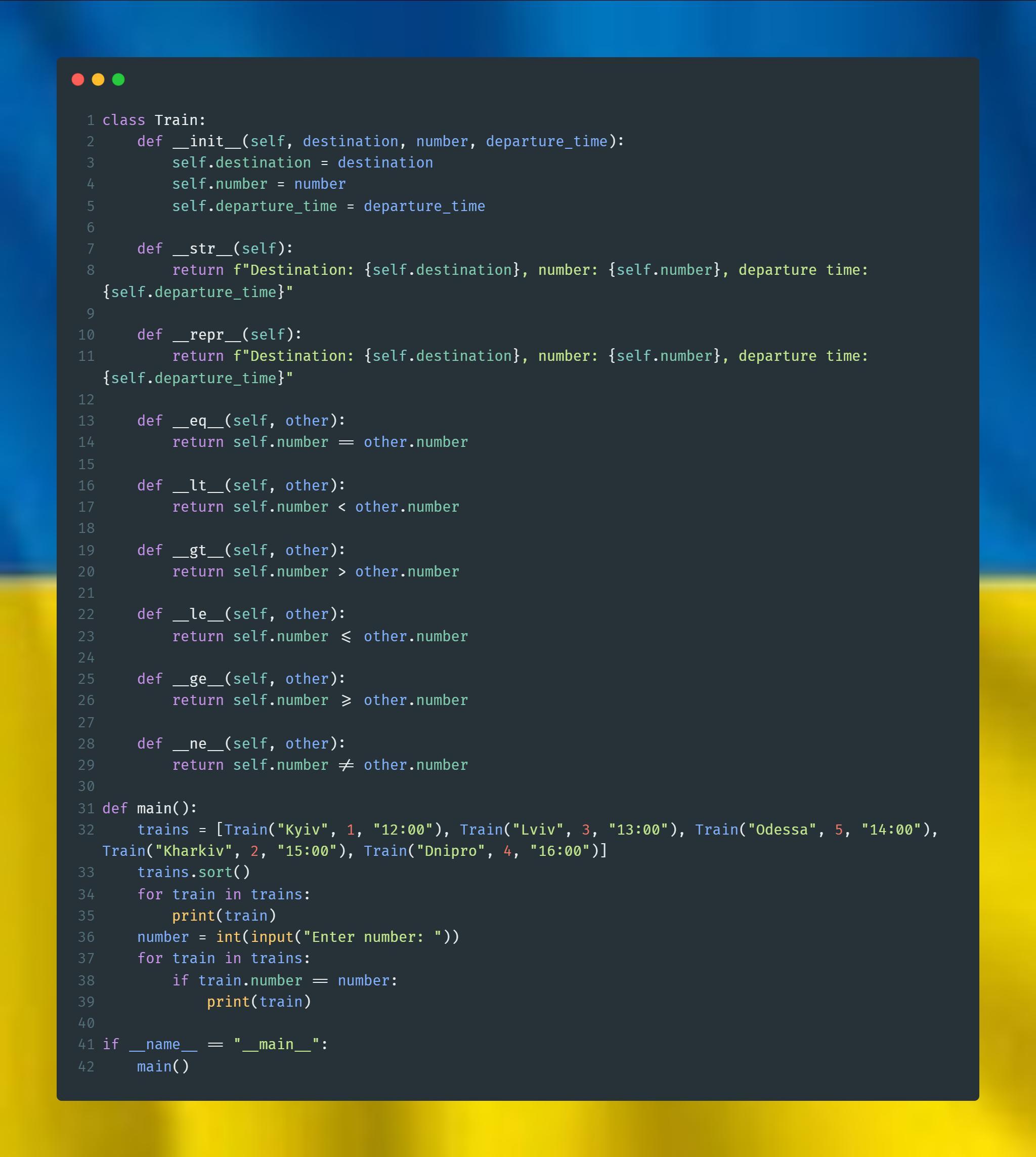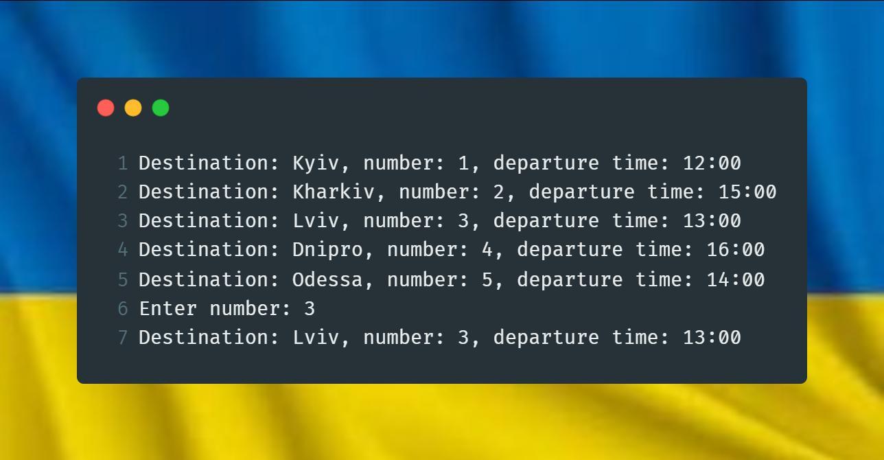 trains = [Train("Kyiv", 1, "12:00"), Train("Lviv", 3, "13:00"), Train("Odessa", 5, "14:00"), Train("Kharkiv", 2, "15:00"), Train("Dnipro", 4, "16:00")]