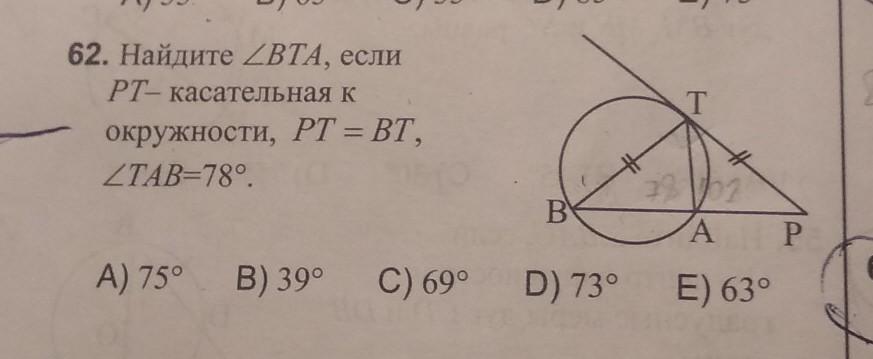 Ответ: угол ВТА = 180 - 39 - 78 = 63 градуса.