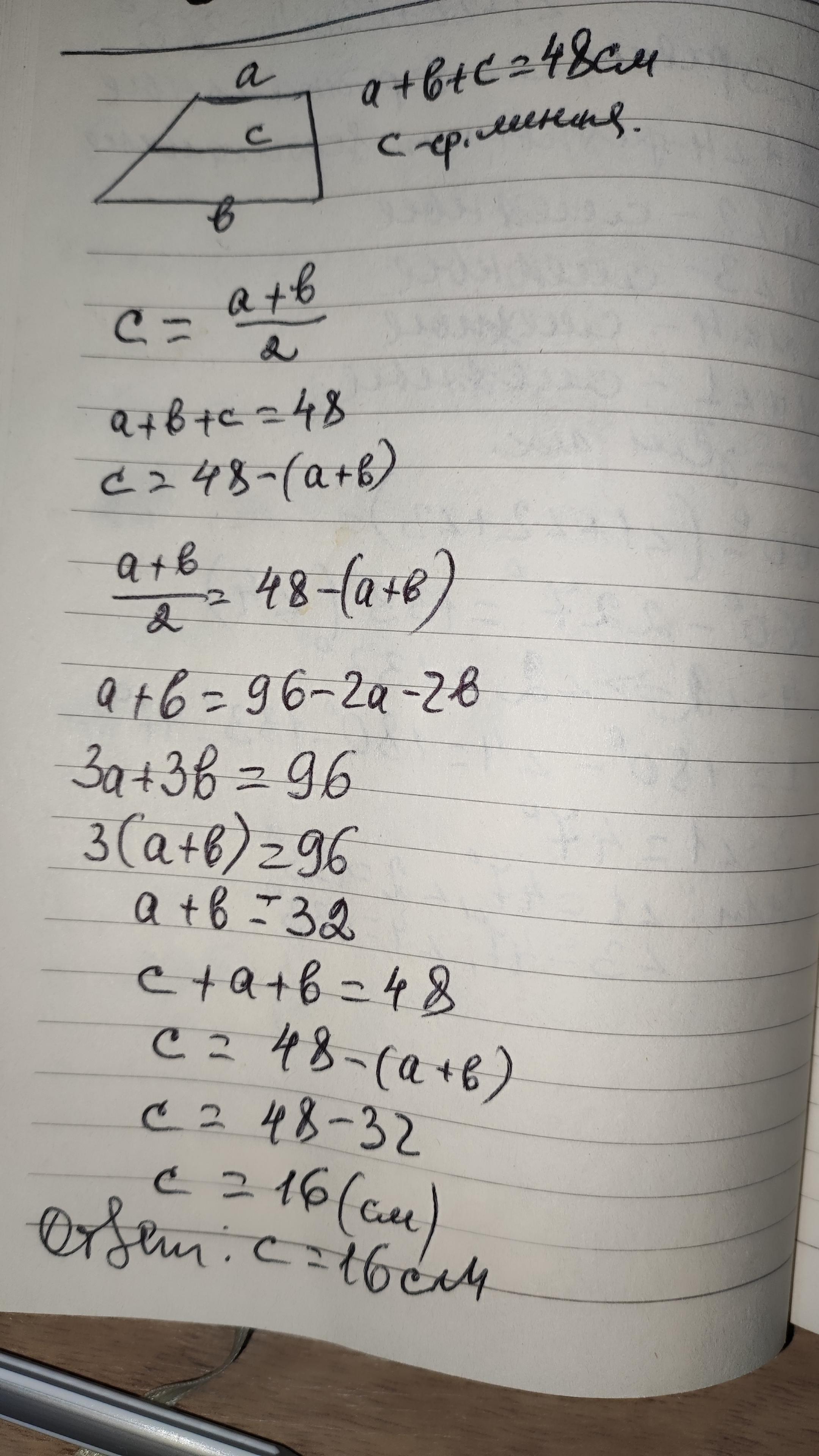 В трапеции со средней линией c основаниями а и b, a+b+c=48 см. Найдите с. А) 24 см B) 16 см С) 12 см D) 18 см Е)20