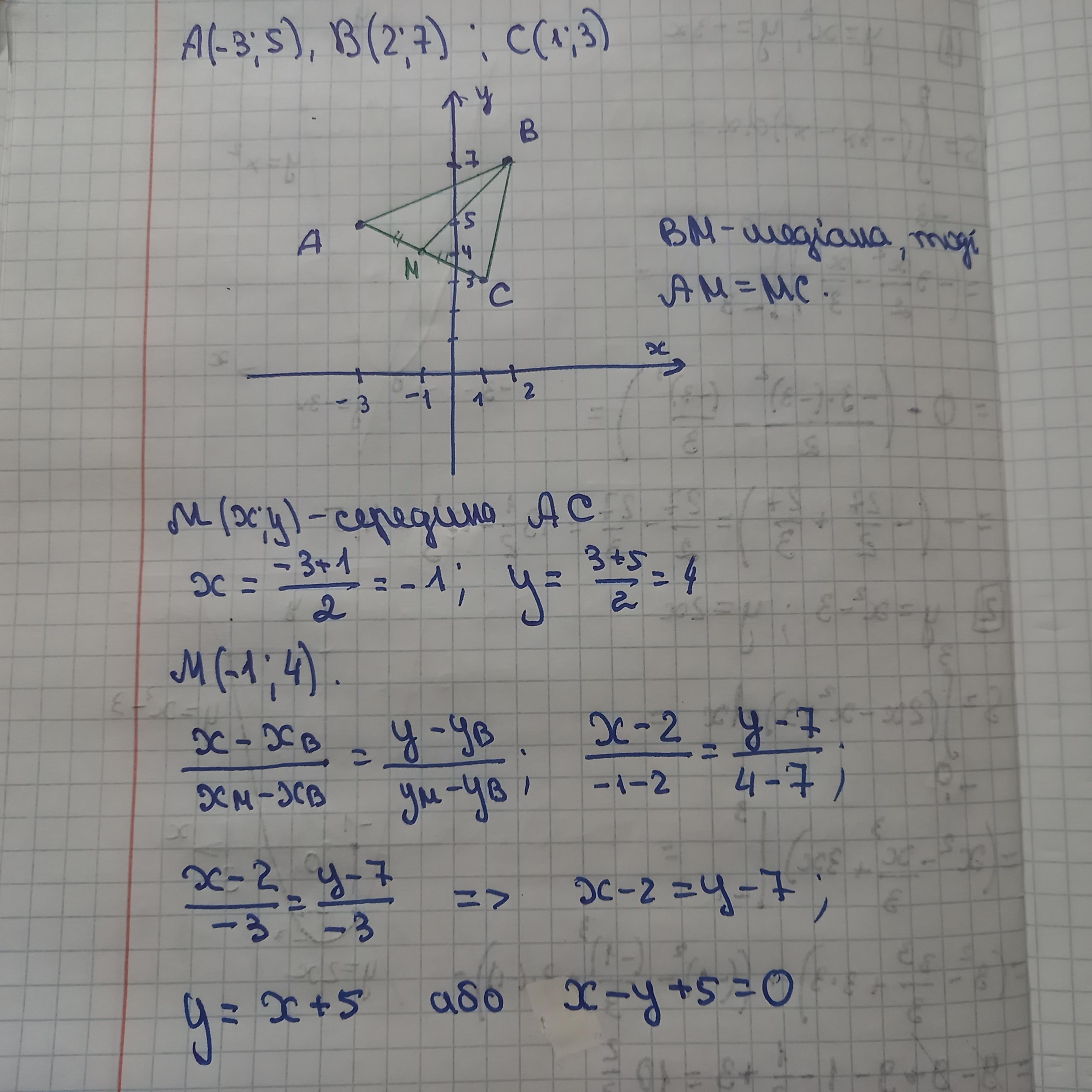 Точки А(-3; 5), B(2; 7) і C(1; 3) – вершини трикутника ABC. Складіть рівняння прямої, яка містить медіану ВМ трикутника.