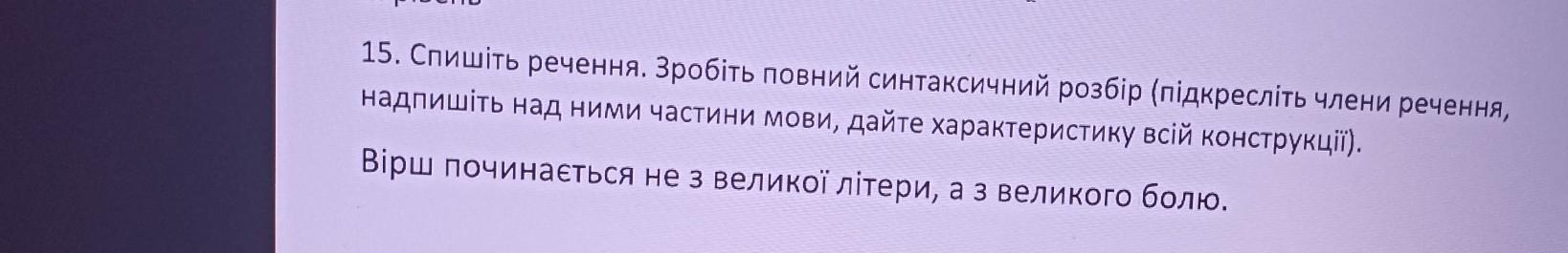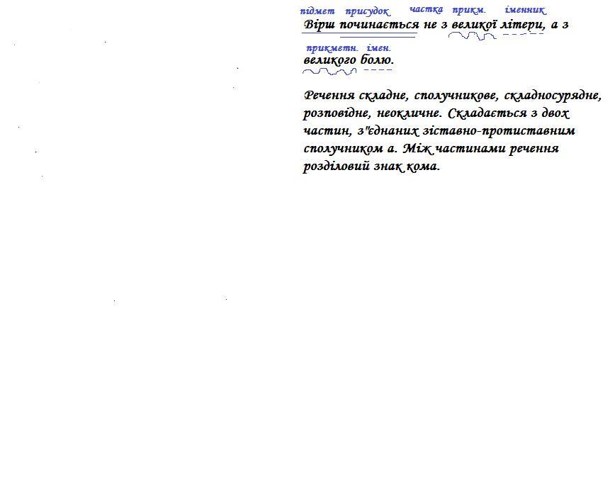 Вірш (підмет/ підкресли однією лінією) починається (присудок/ двома лініями) не (заперечена частка/ підкресли разом зі словом "великої" хвилястою лінією) з великої (прикметник/ хвилястою лінією) літери (додаток/ пунктирною лінією) , а (сполучник) з великого (прикметник/ хвилястою) болю (додаток/ пунктирною лінією).