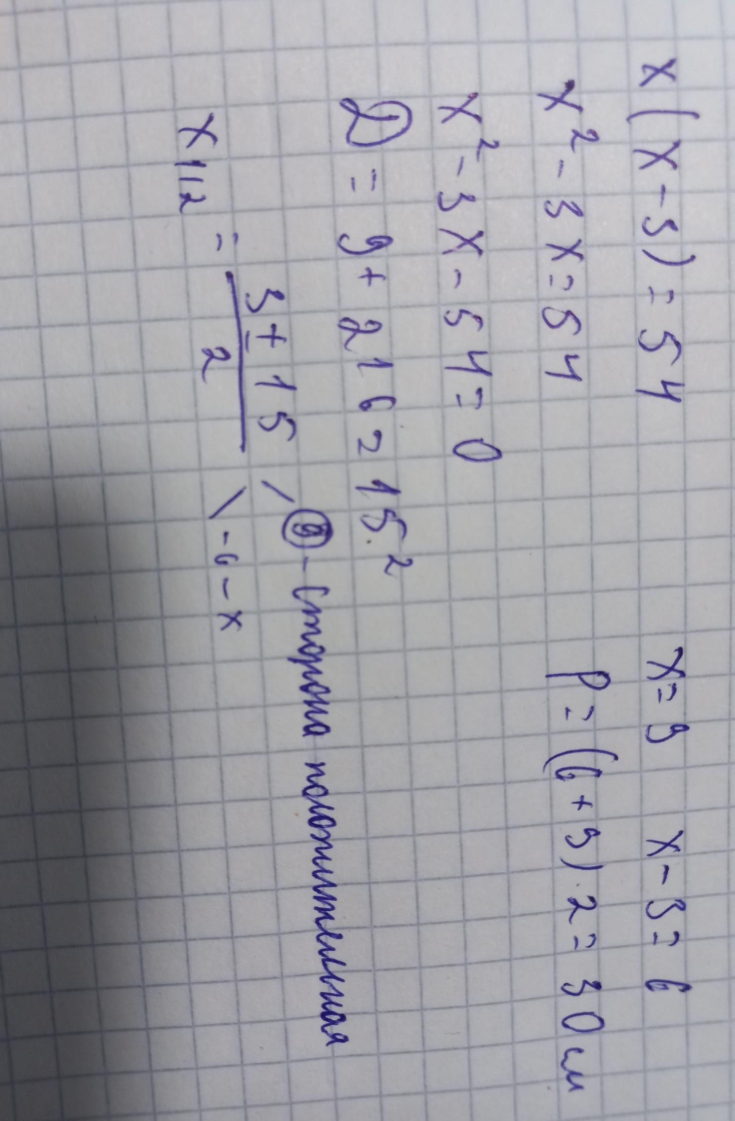 2. Площадь прямоугольника, одна из сторон которого на 3 см больше другой, равна 54 см². Найти стороны и периметр прямоугольника.