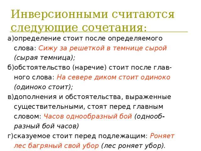 При инверсии сказуемое (=) стоит перед подлежащим, согласованное определение (~~~) после определяемого слова×.
