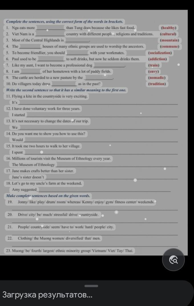 Complete the sentences, using the correct form of the words in brackets. than Tung does because she likes fast food. country with different people religions and traditions. 1. Nga eats more 2. Viet Nam is a 3. Most of the Central Highlands is 4. The 5. To become friendlier, you should 6. Paul used to be houses of many ethnic groups are used to worship the ancestors. with your workmates. to soft drinks, but now he seldom drinks them. 7. Like my aunt, I want to become a professional dog. 8. I am 9. The cattle are herded to a new pasture by the 10. Do villagers today dress Write the second sentence so that it has a similar meaning to the first one. 11. Flying a kite in the countryside is very exciting. It's 12. I have done voluntary work for three years. I started of her hometown with a lot of paddy fields. as in the past? 13. It's not necessary to change the dates of our trip. We 14. Do you want me to show you how to use this? Would 15. It took me two hours to walk to her village. I spent 16. Millions of tourists visit the Museum of Ethnology every year. The Museum of Ethnology 17. Jane makes crafts better than her sister. Jane's sister doesn't 18. Let's go to my uncle's farm at the weekend. Amy suggested 20. Drive/city/be/ much/ stressful/drive/ countryside. 21. People/ countryside/ seem/ have to/work/hard/people/ city. 22. Clothing/ the Muong women/ diversified/ that/ men. Make complete sentences based on the given words. 19. Jonny/like/play/ drum/ room/ whereas/ Kenny/ enjoy/ gym/ fitness center/ weekends. 23. Muong/be/ fourth/ largest/ethnic minority group/ Vietnam/Viet/ Tay/Thai. (healthy) (cultural) (mountain) (commune) (socialization) (addiction) (train) (envy) (nomadic) (tradition) hall