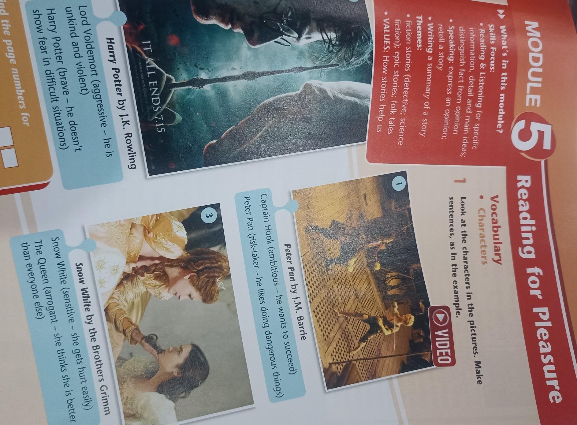 MODULE 5 What's in this module? Skills Focus: • Reading & Listening for specific information, detail and main ideas; distinguish fact from opinion Speaking: express an opinion; retell a story Writing a summary of a story Themes: fiction stories (detective; science- fiction); epic stories; folk tales • VALUES: How stories help us IT ALL ENDS 7.15 IMAX 3G real 2020TIAR Harry Potter (brave - he doesn't show fear in difficult situations) Reading for Pleasure Vocabulary Characters Harry Potter by J.K. Rowling Lord Voldemort (aggressive - he is unkind and violent) Find the page numbers for biographies a comic strip a spidergram 1 ● Look at the characters in the pictures. Make sentences, as in the example. VIDEO Peter Pan by J.M. Barrie Captain Hook (ambitious - he wants to succeed) Peter Pan (risk-taker - he likes doing dangerous things) 3 Snow White by the Brothers Grimm Snow White (sensitive - she gets hurt easily) The Queen (arrogant - she thinks she is better than everyone else) Captain Hook is ambitious. He wants to succeed. Peter Pan is .... M O