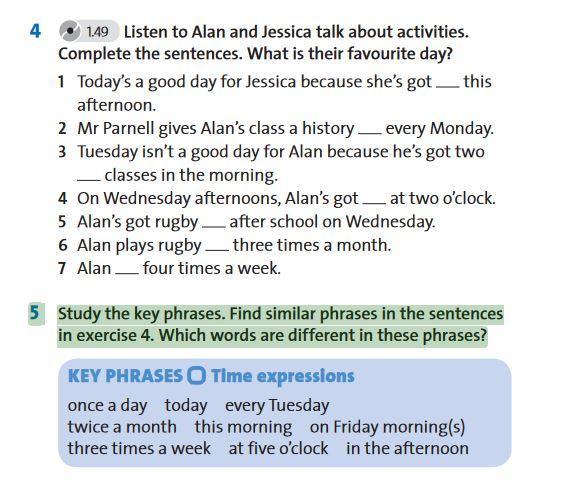 5 Study the key phrases. Find similar phrases in the sentences in exercise 4. Which words are different in these phrases? KEY PHRASES O Time expressions once a day today every Tuesday twice a month this morning on Friday morning(s) three times a week at five o'clock in the afternoon