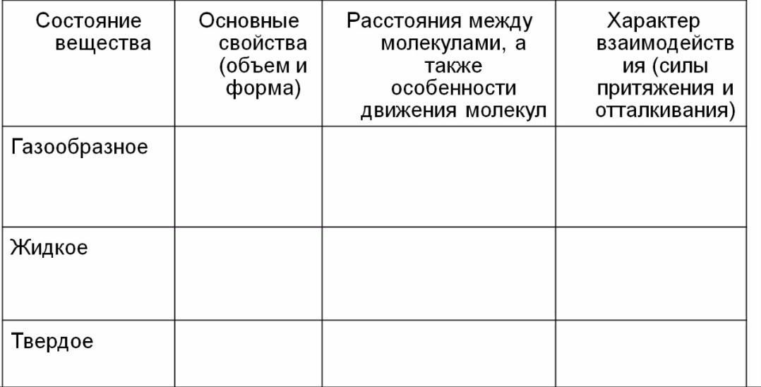 2.1) сохраняет объем; образует поверхность; 2) принимает форму сосуда; обладает текучестью 3) не сильное взаимодействие между молекулами.