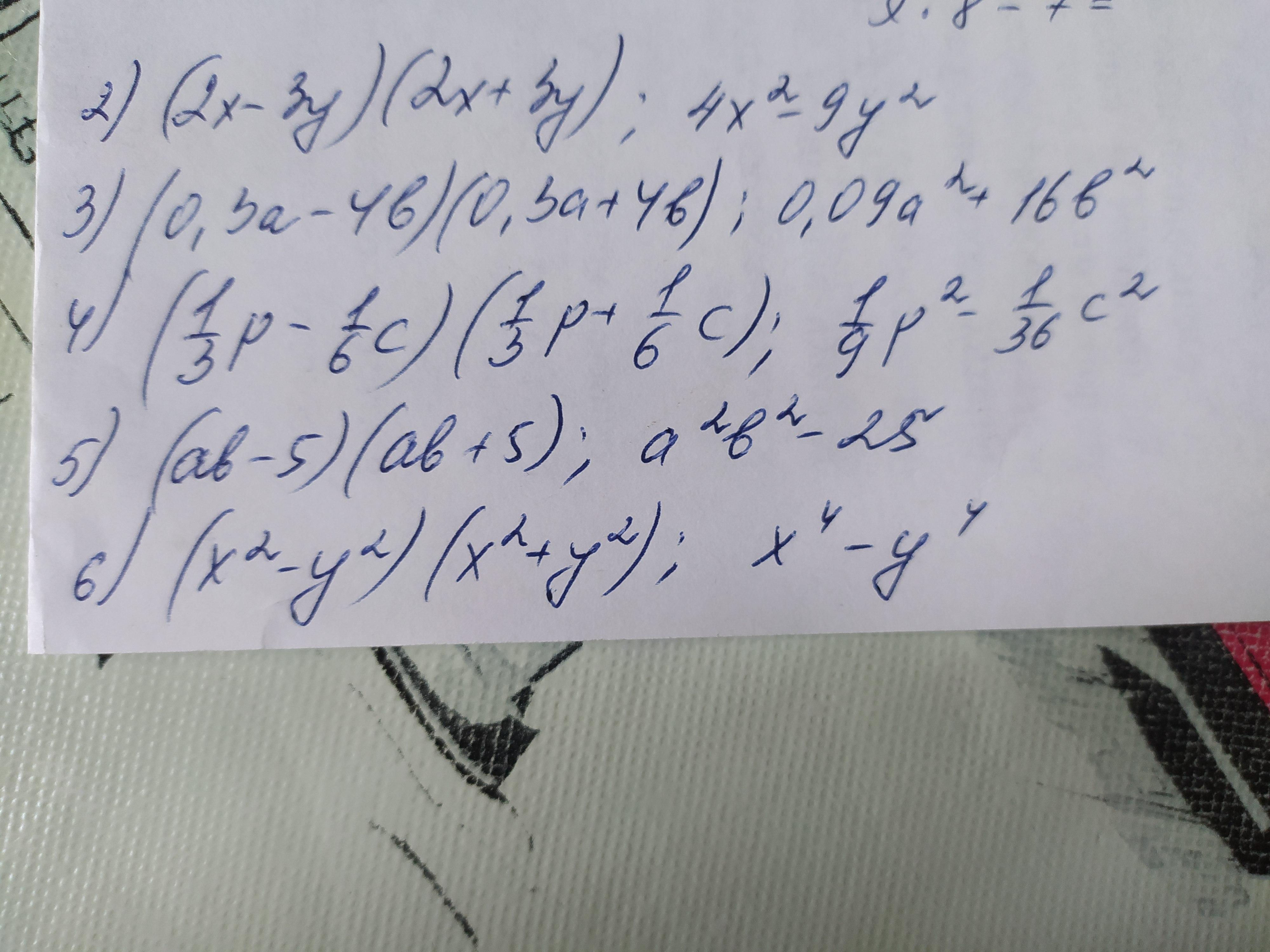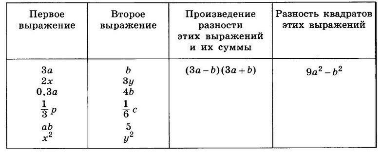 Первое выражение За 2x 0,3а 1 3 P ab x2 Второе выражение b Зу 4b 6 с 5 y Произведение разности этих выражений и их суммы (3a-b)(3a+b) Разность квадратов этих выражений 9a2-b2 Дам 45 баллов!!!! срочнооо