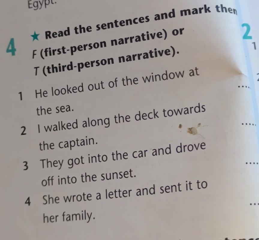 4 ★ Read the sentences and mark then F (first-person narrative) or T (third-person narrative). 1 He looked out of the window at the sea. 2 I walked along the deck towards the captain. 3 They got into the car and drove off into the sunset. 4 She wrote a letter and sent it to her family. .....