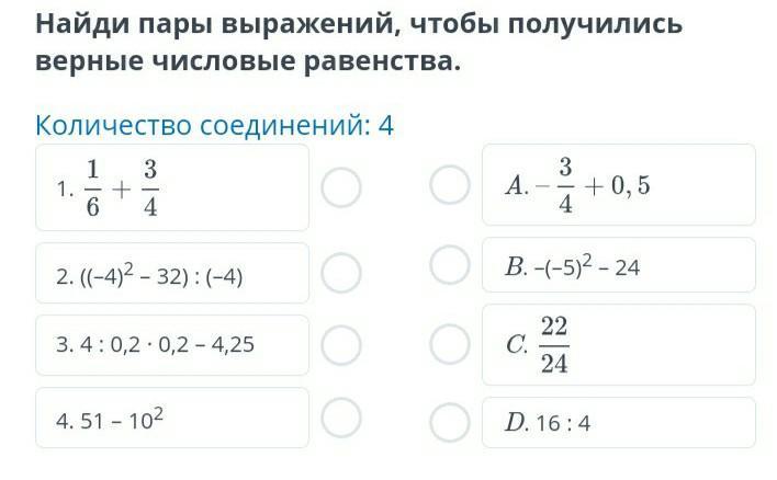 Найди пары выражений, чтобы получились верные числовые равенства. Количество соединений: 4 1 3 + 6 4 - 2. ((-4)²-32): (-4) 1. - 3.4: 0,2 0,2 -4,25 4.51-10² А. с. 3 OF - 4 О B. -(-5)2 - 24 22 24 +0,5 D. 16:4