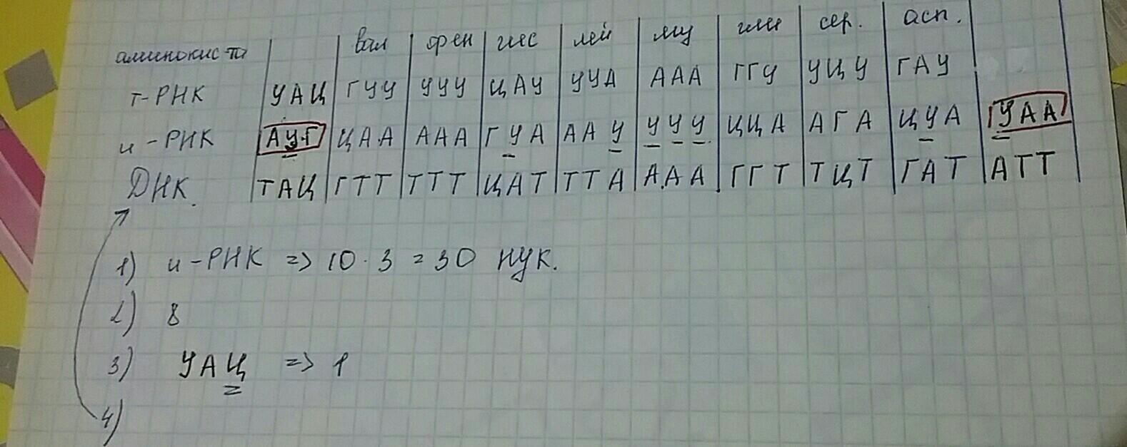 B цепи "B" инсулина первые десять аминокислот располагаются следующим образом: вал-фен-гис-лей-лиз-гли- сер-асп. Постройте участок и-РНК, кодирующий данную цепь инсулина