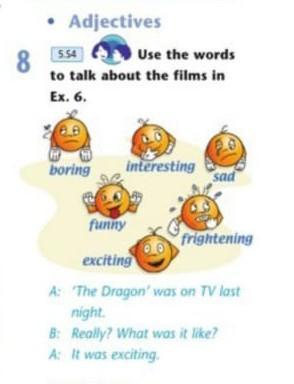 8 Adjectives 5.54 Use the words to talk about the films in Ex. 6. boring interesting sad funny exciting A: 'The Dragon' was on TV last night. B: Really? What was it like? A: It was exciting. frightening