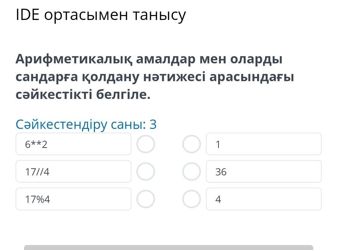 IDE ортасымен танысу Арифметикалық амалдар мен оларды сандарға қолдану нәтижесі арасындағы сәйкестікті белгіле. Сәйкестендіру саны: 3 6**2 17//4 17%4 1 36 4 20 баллов дам пж помогите