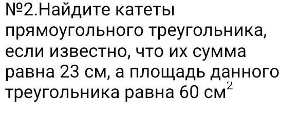 №2.Найдите катеты прямоугольного треугольника, если известно, что их сумма равна 23 см, а площадь данного треугольника равна 60 см2