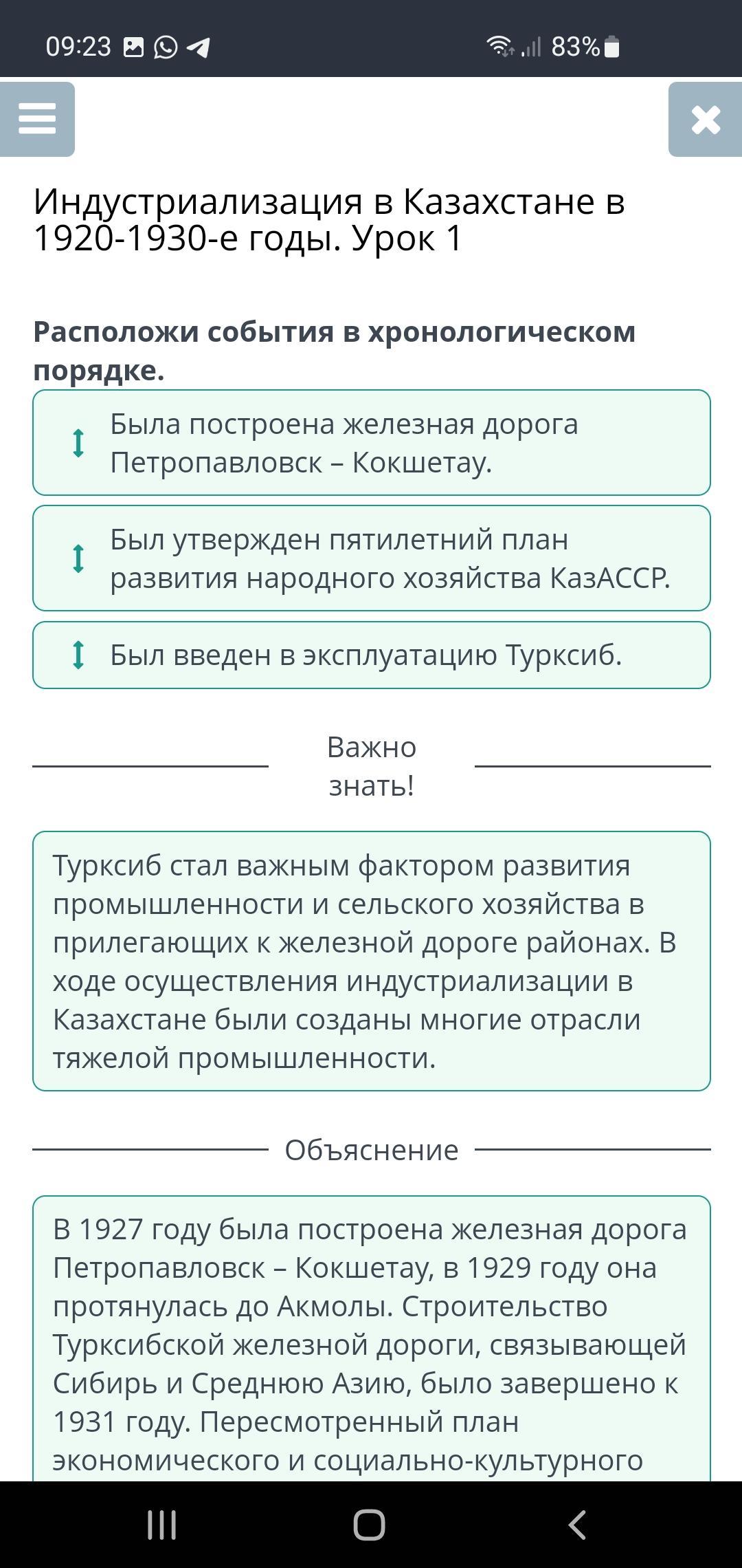 Индустриализация в Казахстане в 1920-1930-е годы. Урок 1 Расположи события в хронологическом порядке. Был введен в эксплуатацию Турксиб. 1 Был утвержден пятилетний 1 план развития народного хозяйства КазАССР. Была построена железная 1 дорога Петропавловск – Кокшетау.