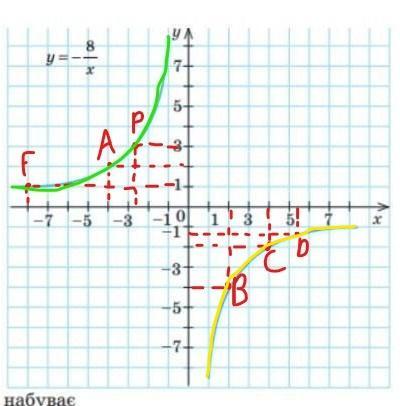 3) функція набуває додатніх значень при усіх від'ємних значеннях аргумента (виділена зеленим кольором)