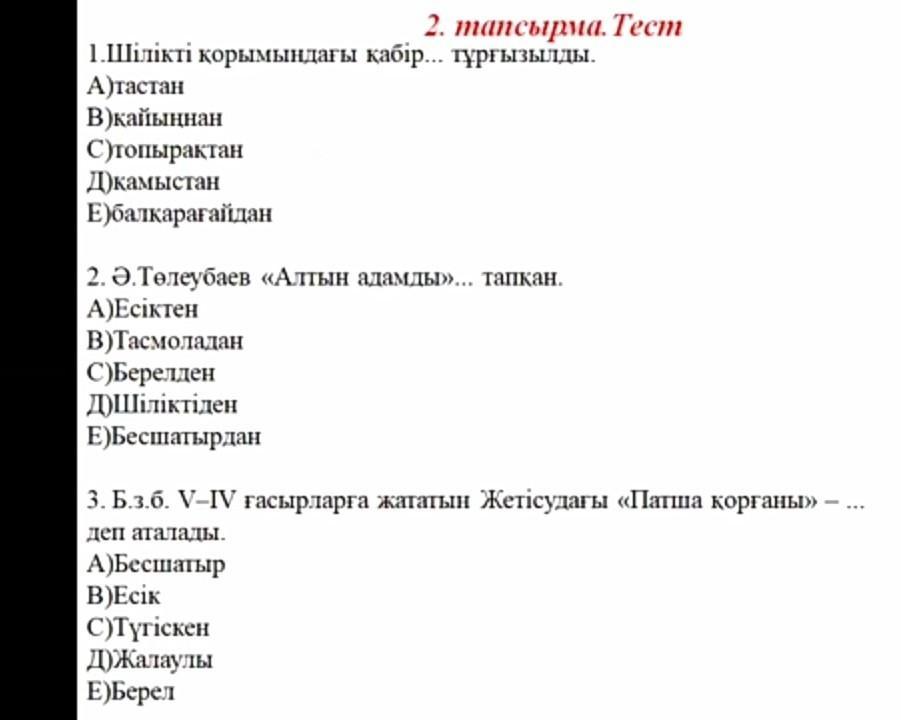 2. тапсырма. Тест қабір... тұрғызылды. 1.Шілікті корымындағы А)тастан В кайыңнан C)топырақтан Д)камыстан Е)балкарагайдан 2. Ә.Төлеубаев «Алтын адамды»... тапкан. А)Есіктен В)Тасмоладан С)Берелден Д)Шіліктіден Е)Бесшатырдан 3. Б.з.б. V-IV ғасырларға жататын Жетісудағы «Патша корганы» - ... деп аталады. А)Бесшатыр B)Ecik С)Түгіскен Д)Жалаулы Е)Берел комектесіндерш пж