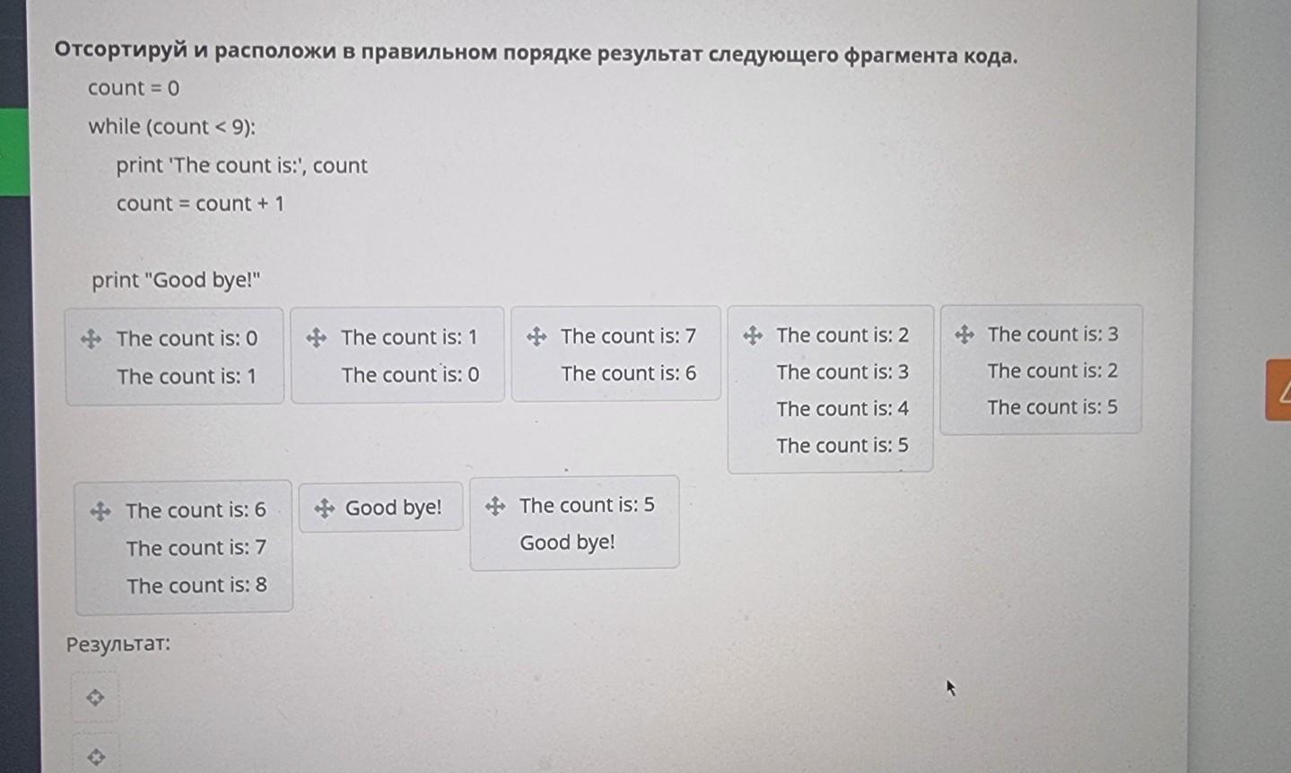 Отсортируй и расположи в правильном порядке результат следующего фрагмента кода. count = 0 while (count < 9): print 'The count is:', count count = count + 1 print "Good bye!"