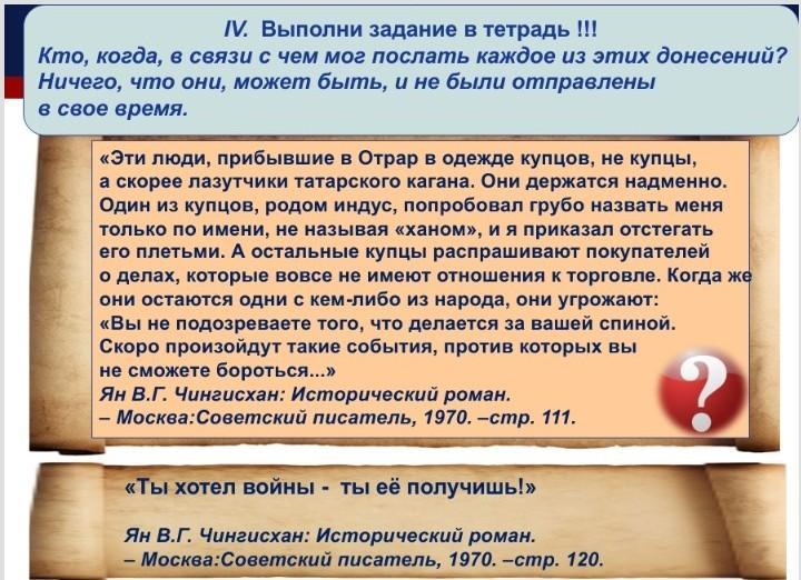 Кто, когда, в связи с чем мог послать каждое из этих донесени ? Ничего, что они, может быть, и не были отправлены в свое время. > Ян В.Г. Чингисхан: Исторический роман. - Москва: Советский писатель, 1970. -стр. 111. «Ты хотел войны - ты еë получишь!» Ян В.Г. Чингисхан: Исторический роман. - Москва: Советский писатель, 1970.-сmp. 120.