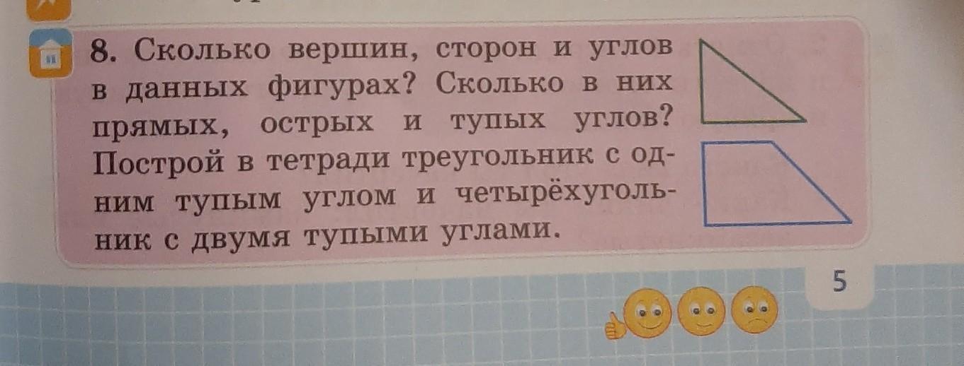 8. Сколько вершин, сторон и углов в данных фигурах? Сколько в них прямых, острых и тупых углов? Построй в тетради треугольник с од ним тупым углом и четырёхуголь- ник с двумя тупыми углами.