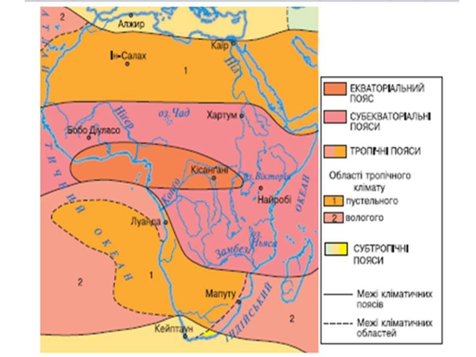 Підскажіть будь ласка Завдання 1. Позначте на контурній карті назви кліматичних поясів та областей Африки.