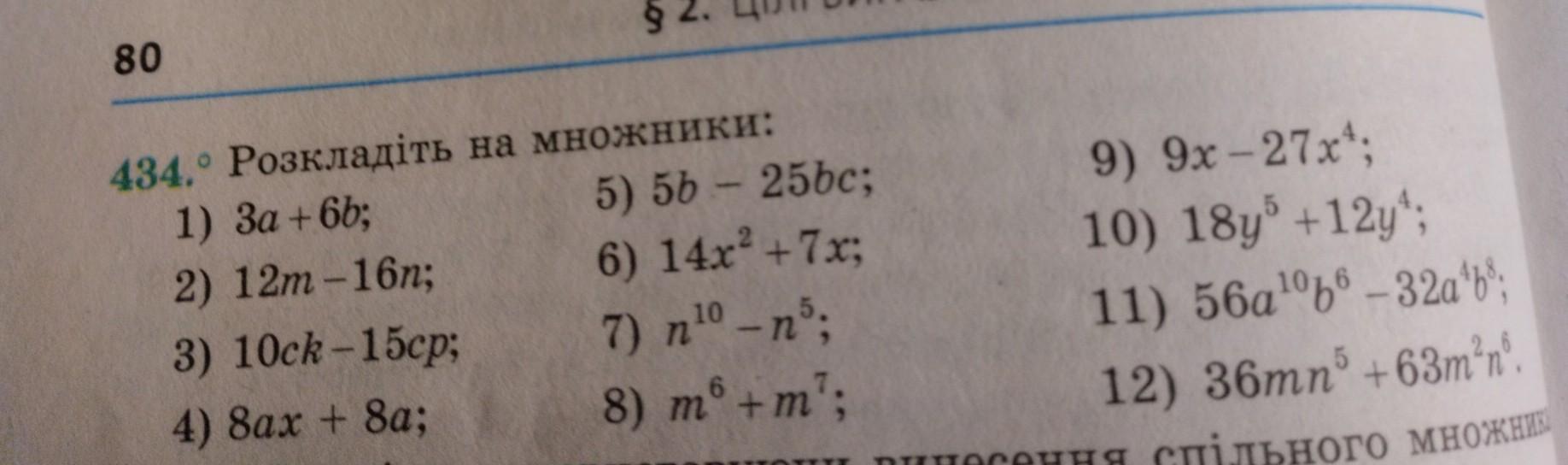 30 34.° Розкладiть на множники: 1) 3a + 60: 2) 12m-16n; 3) 10ck-15ер; 4) 8ax + 8a; O 5) 5b - 25bc; 6) 14x²+7x; 7) n¹0-n³; 8) m³ + m'; 9) 9x-27x*; 10) 18y +12y¹; 11) 56a¹0b6-32a¹b%; 12) 36mn +63m²nº. сліть, використовуючи винесення спільного множник