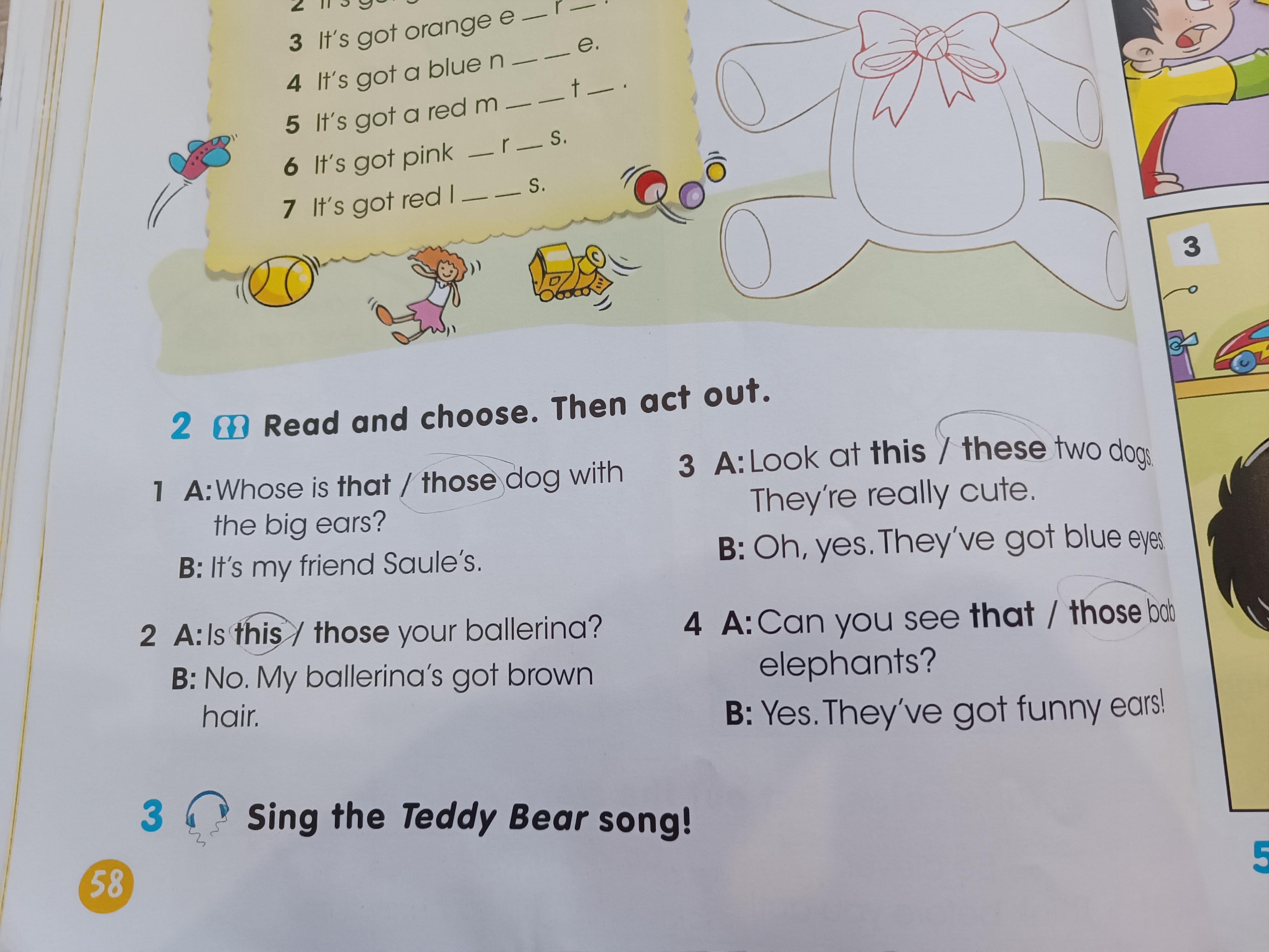 Read and choose. Then act out. those dog with 2 1 A:Whose is that the big ears? B: It's my friend Saule's. 2 A: is this / those your ballerina? B: No. My ballerina's got brown hair. 3 A: Look at this / these two dogs. They're really cute. B: Oh, yes. They've got blue eyes. 4 A: Can you see that / those bab elephants? B: Yes. They've got funny ears! 10балл беремін.Өтініш