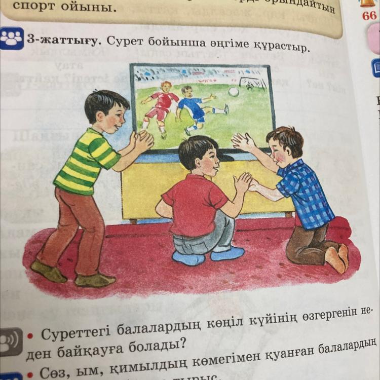 Ерлан, Айбек, Жандос футбол ойнағанды қатты ұнатады. Теледидардағы футбол ойындарын әруақытта бірге көреді. Бүгін міне, өздері қолдайтын команданың жеңісіне бірге шаттануда.