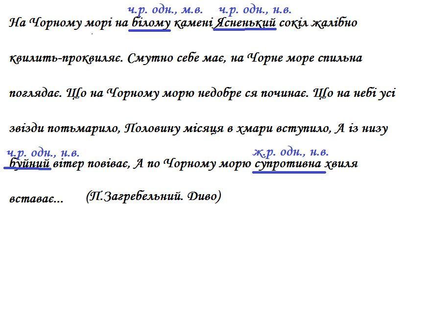 виписати з художньої літератури уривок тексту, підкреслити прикметники, надписати вгорі їхній рід, число, відмінок)