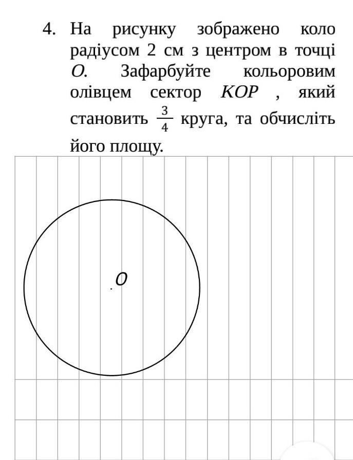 На рисунку зображено коло радіусом 2 см з центром в точці О. Зафарбуйте кольоровим олівцем сектор KOP , який становить 3/4 круга, та обчисліть його площу.