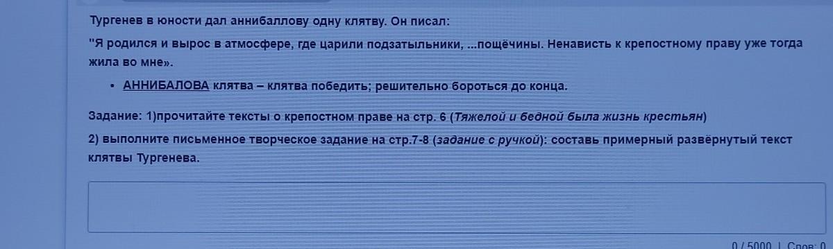 5 Тургенев в юности дал аннибаллову одну клятву. Он писал: "Я родился и вырос в атмосфере, где царили подзатыльники, ...пощечины. Ненависть к крепостному праву уже тогда жила во мне». 5 из 5 . АННИБАЛОВА клятва - клятва победить; решительно бороться до конца. Задание: 1)прочитайте тексты о крепостном праве на стр. 6 (Тяжелой и бедной была жизнь крестьян) 2) выполните письменное творческое задание на стр.7-8 (задание с ручкой): составь примерный развернутый текст клятвы Тургенева. Далее 0/5000 | Слов: 0 Завершить