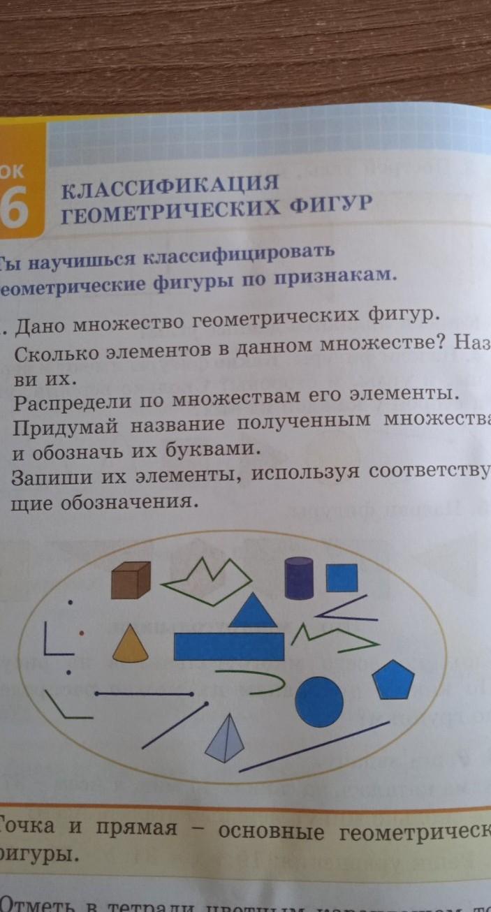 геометрические фигуры по признакам. 1. Дано множество геометрических фигур. Сколько элементов в данном множестве? Назо- ви их. Распредели по множествам его элементы. Придумай название полученным множествам и обозначь их буквами. Запиши их элементы, используя соответствую- щие обозначения. . . ●