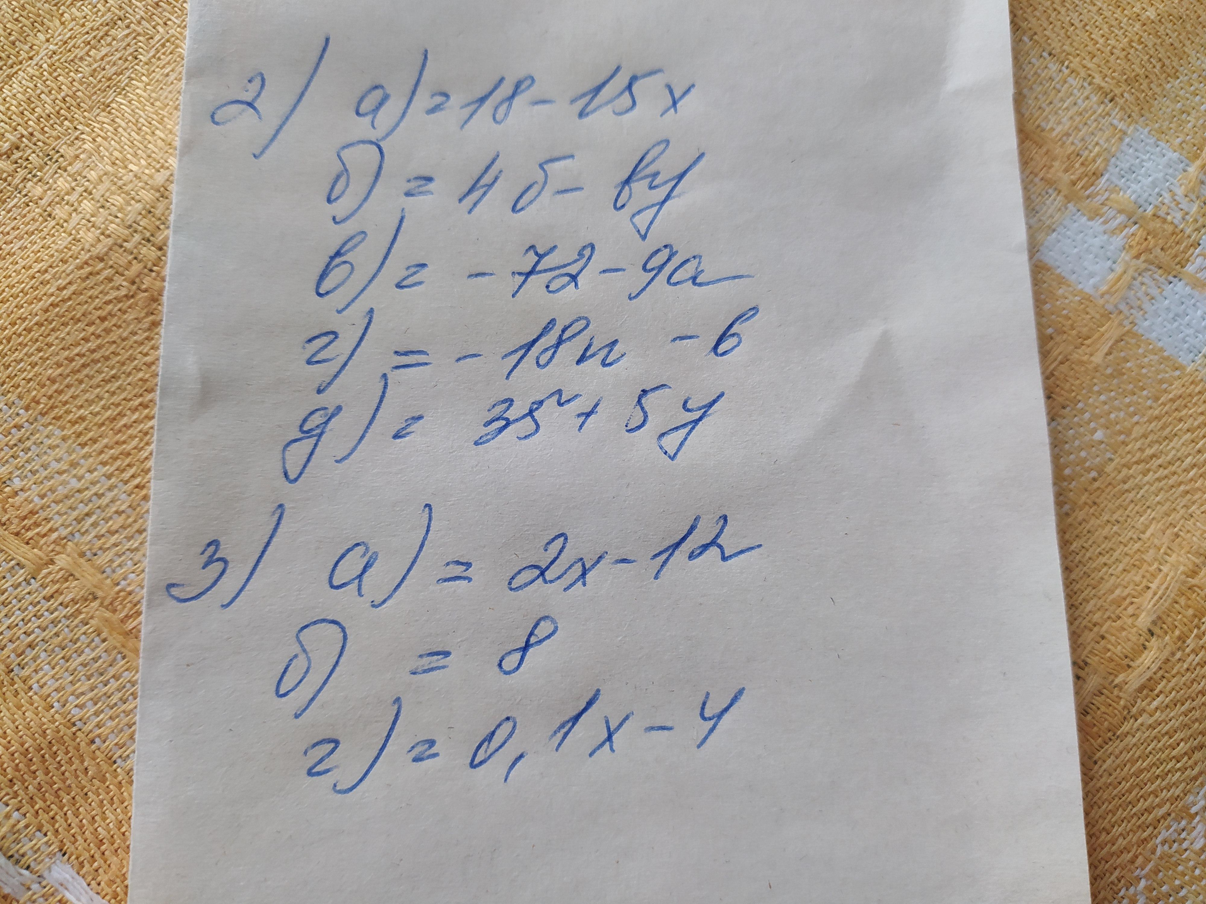 2) Раскройте скобки: а) 3(6-5х); б) (4-у) б; в) 9( - 8-а); (3n+1)(-6); д) -5( -7 - y) 3) Приведите подобные слагаемые: в) 18-3m- а) 4x-12-2x б) -ба-2+ба 10 г)0,3х-6-0,2х+2 г)