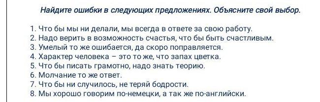 СРОЧНО ДАЮ 100 БАЛЛ Найдите ошибки в следующих предложениях. Объясните свой выбор. 1. Что бы мы ни делали, мы всегда в ответе за свою работу. 2. Надо верить в возможность счастья, что бы быть счастливым. 3. Умелый то же ошибается, да скоро поправляется. 4. Характер человека - это то же, что запах цветка. 5. Что бы писать грамотно, надо знать теорию. 6. Молчание то же ответ. 7. Что бы ни случилось, не теряй бодрости. 8. Мы хорошо говорим по-немецки, а так же по-английски.