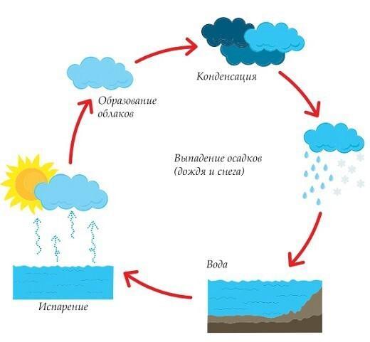 6)Круговоро́т воды́ в приро́де (гидрологи́ческий цикл), влагооборо́т — процесс циклического перемещения воды в земной биосфере. Состоит из испарения воды, переноса паров воздушными течениями, их конденсации, выпадения в виде осадков (дождь, снег и т. д.) и переноса воды реками и другими водными объектами. Вода испаряется с поверхности суши и водоёмов (рек, озёр, водохранилищ и т. д.), однако бо́льшая часть воды испаряется с поверхности Мирового океана. Круговорот воды связывает воедино все части гидросферы.