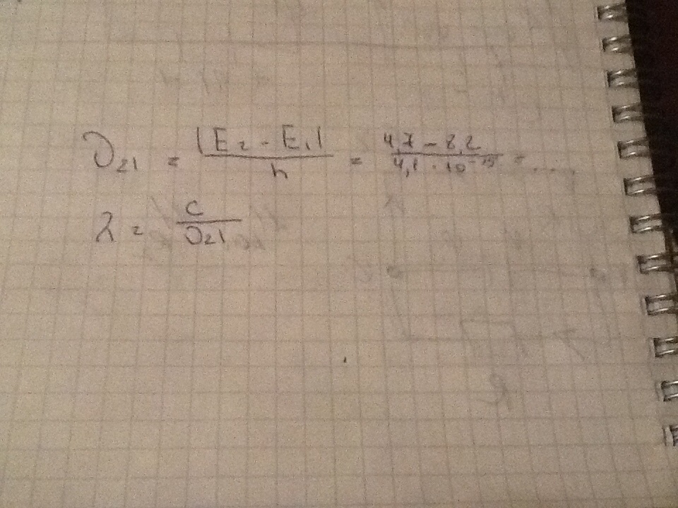 Электрон переходит со стационарной орбиты с энергией -8,2 эВ на орбиту с энергией -4,7 эВ. Определить длину волны поглощаемого при этом протона.