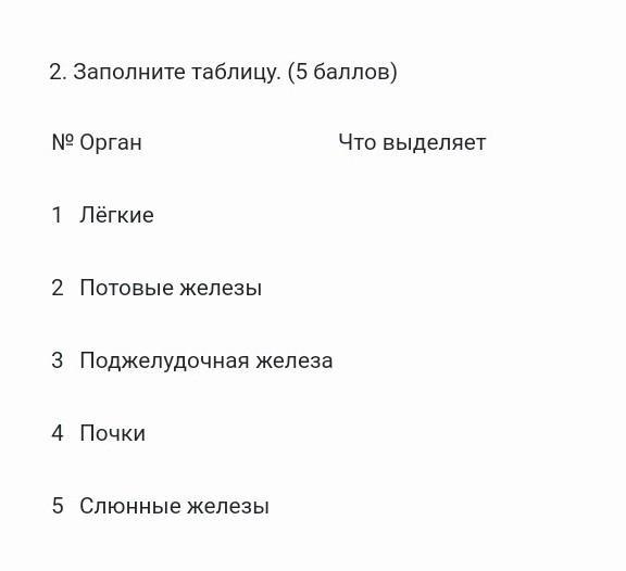 2. Заполните таблицу. (5 баллов) № Орган 1 Лёгкие 2 Потовые железы 3 Поджелудочная железа 4 Почки 5 Слюнные железы Что выделяет