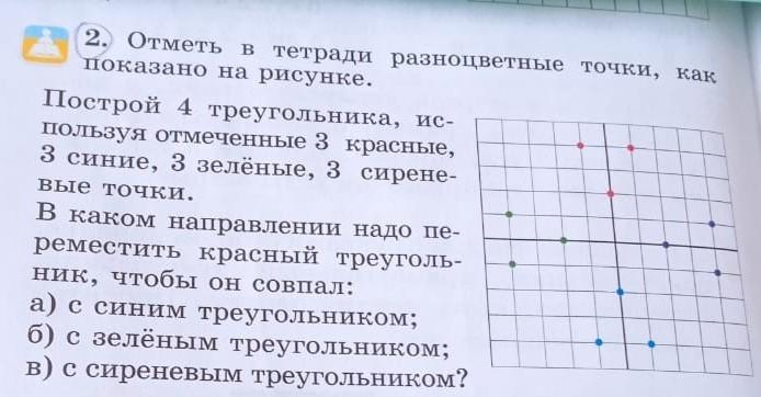 2. Отметь в тетради разноцветные точки, как показано на рисунке. Построй 4 треугольника, ис- пользуя отмеченные 3 красные, 3 синие, 3 зелёные, 3 сирене- вые точки. В каком направлении надо пе- реместить красный треуголь- ник, чтобы он совпал: a) с синим треугольником; б) с зелёным треугольником; в) с сиреневым треугольником?