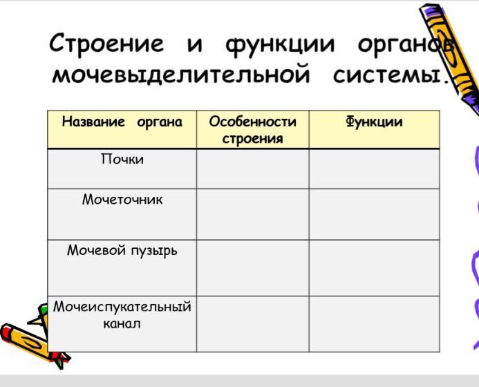 функции: удаление из крови продуктов обмена, образование мочи (корковый слой: образование первичной мочи, мозговой слой: образование вторичной мочи), поддержание постоянства внутренней среды (гомеостаз), регуляция водно-солевого обмена.