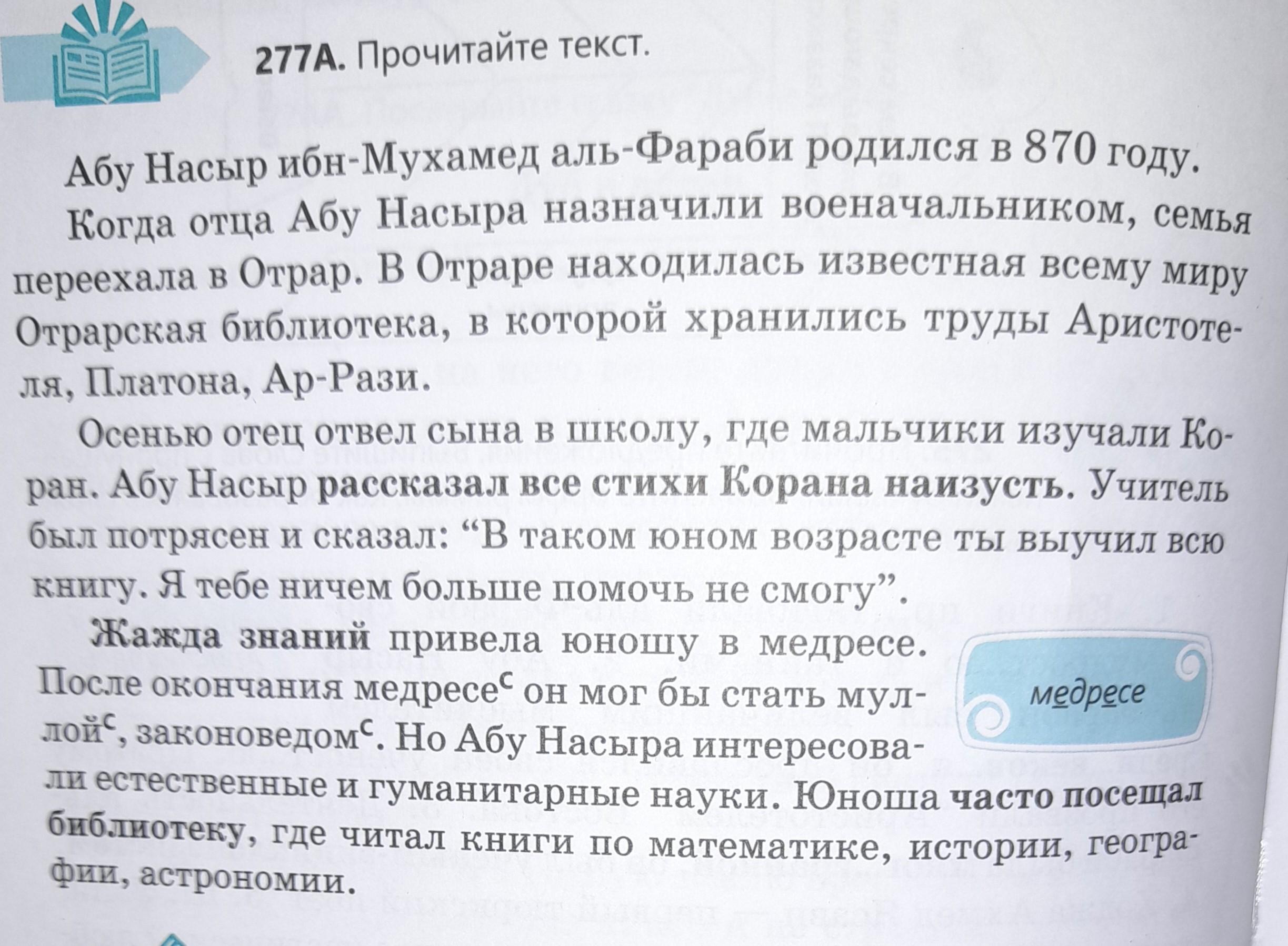 277г. Найдите в тексте информацию о городе Отраре. От- рарской библиотеке и о том, как учился Абу Насыр аль-Фараби Какая информация является главной, а какая ВТОРОСТЕПЕН- ной? Прочитайте выделенные выражения. Как они характеризу ют аль-Фараби? Какие качества его характера они описывают? Помогли ли ему эти качества стать выдающимся мыслителем Средневековья?