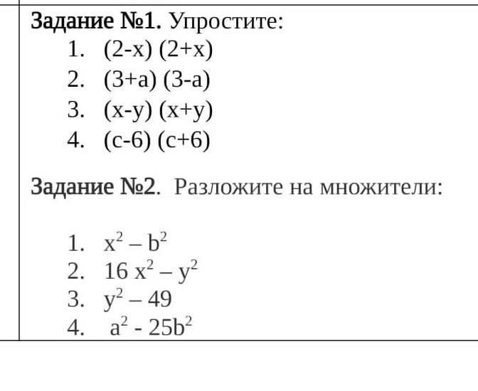 ДАЮ 35 БАЛЛОВ!!!!! Задание №1. Упростите: 1. (2-x) (2+x) 2. (3+a) (3-a) 3. (x-y) (x+y) 4. (c-6) (c+6) Задание №2. Разложите на множители: 1. x²-b² 2. 3. 4. 16 x² - у² y² - 49 a² - 25b2