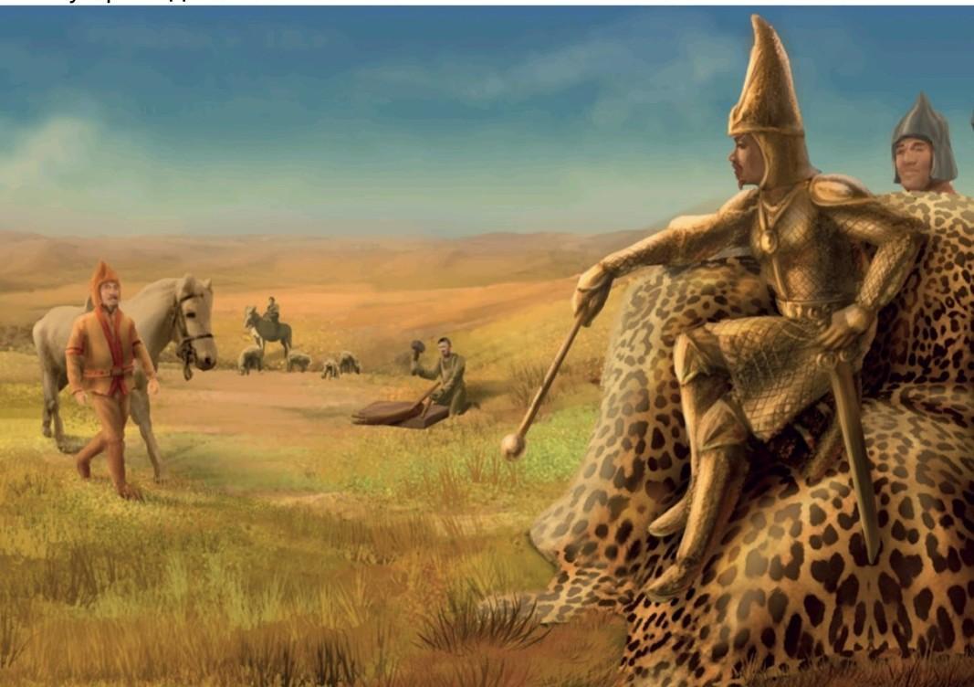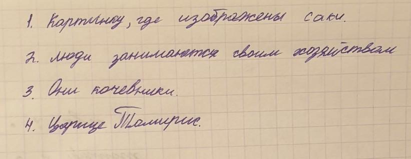 1. Что вы видите? 2.Чем занимаются люди? 3. Что можно рассказать о сакском обществе, по их одежде и ремеслу? 4.Кому принадлежала власть?