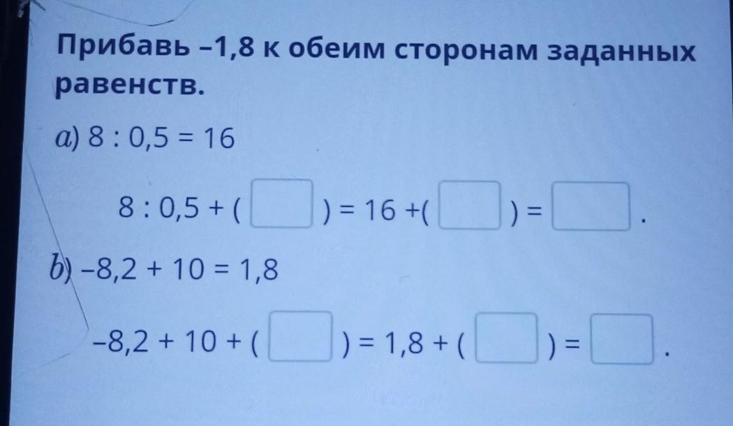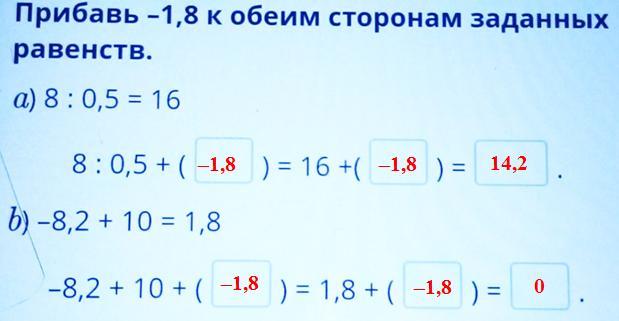 Прибавь -1,8 к обеим сторонам заданных - равенств. a) 8: 0,5 = 16 8: 0,5+ ( )= 16+) = b) -8,2 + 10 = 1,8 -8,2 + 10 + ( ) = 1,8 + ( )=