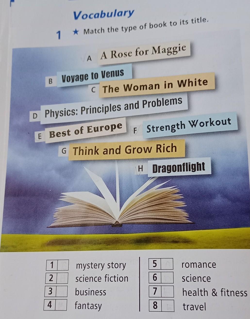 Match the type of book to it is title A. A rose for magic B. Voyage to venus C. The woman in white D. Physics: principles and problems E. Best of Europe F. Strength workout G. Think and grow rich H. Dragon flight