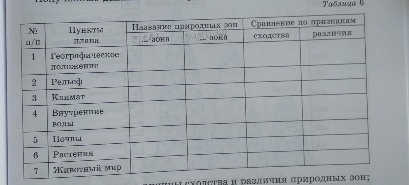 № п/п 1 - Пункты плана Географическое положение 2 Рельеф 3 Климат 4 Внутренние воды 5 Почвы 6 Растения 7 Животный мир Название природных зон ... зона ... зона Таблица 6 Сравнение по признакам сходства различия