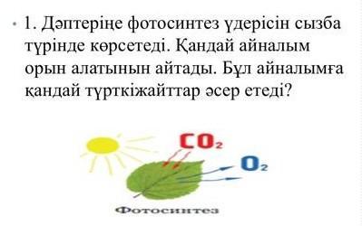 . 1. Дәптеріңе фотосинтез үдерісін сызба түрінде көрсетеді. Кандай айналым орын алатынын айтады. Бұл айналымға кандай түрткіжайттар әсер етеді? CO2 Фотосинтез 0₂