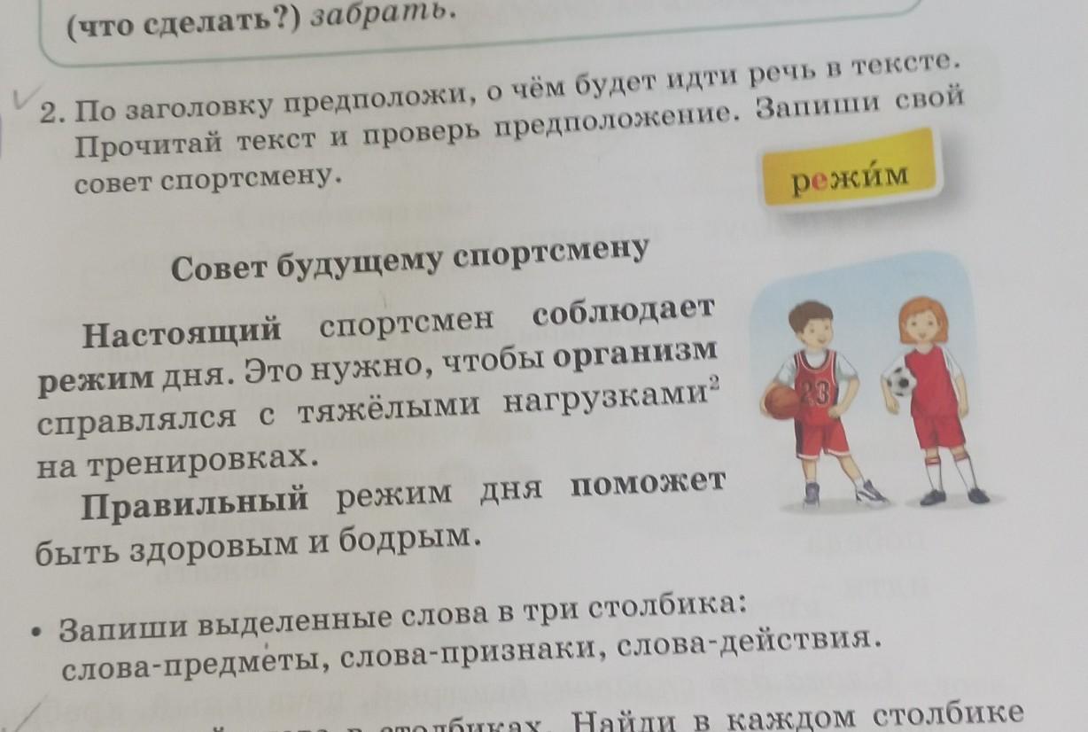 (что сделать?) забрат 2. По заголовку предположи, о чём будет идти речь в тексте. Прочитай текст и проверь предположение. Запиши свой совет спортсмену. режим Совет будущему спортсмену Настоящий спортсмен спортсмен соблюдает режим дня. Это нужно, чтобы организм справлялся с тяжёлыми нагрузками2 на тренировках. Правильный режим дня поможет быть здоровым и бодрым. • Запиши выделенные слова в три столбика: слова-предметы, слова-признаки, слова-действия. помогите пожалуйста