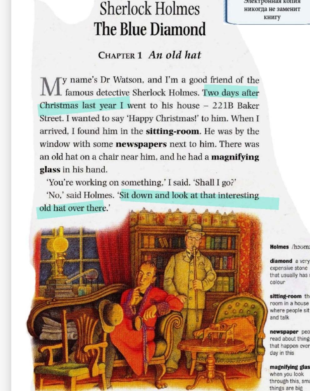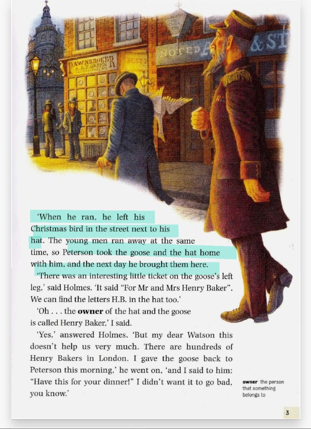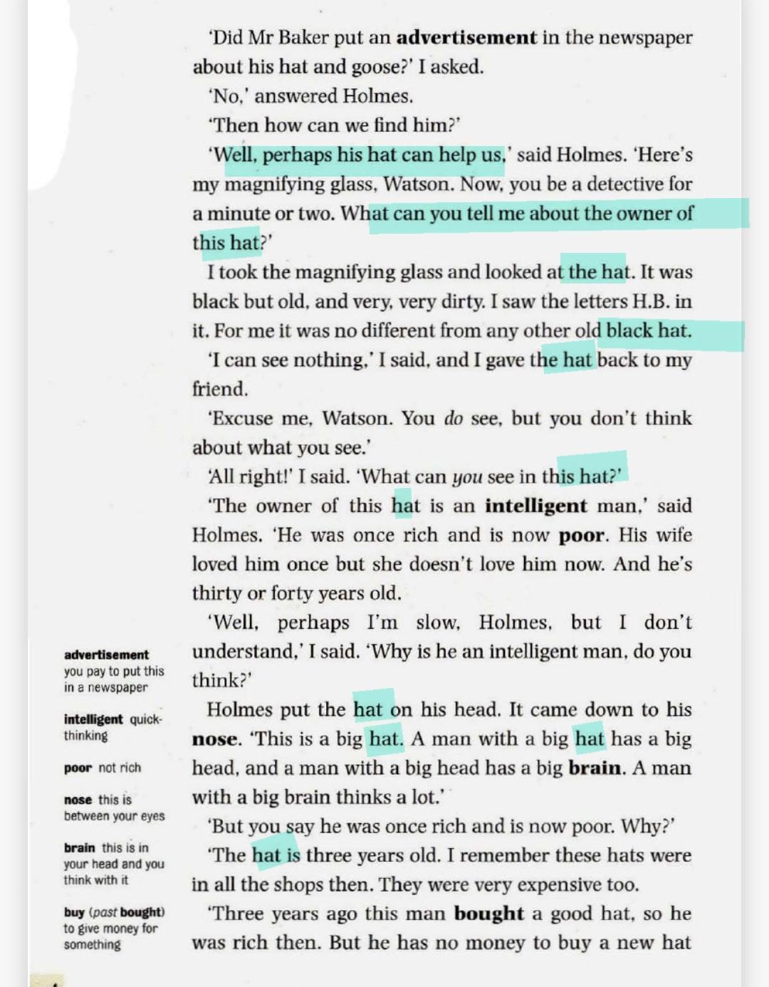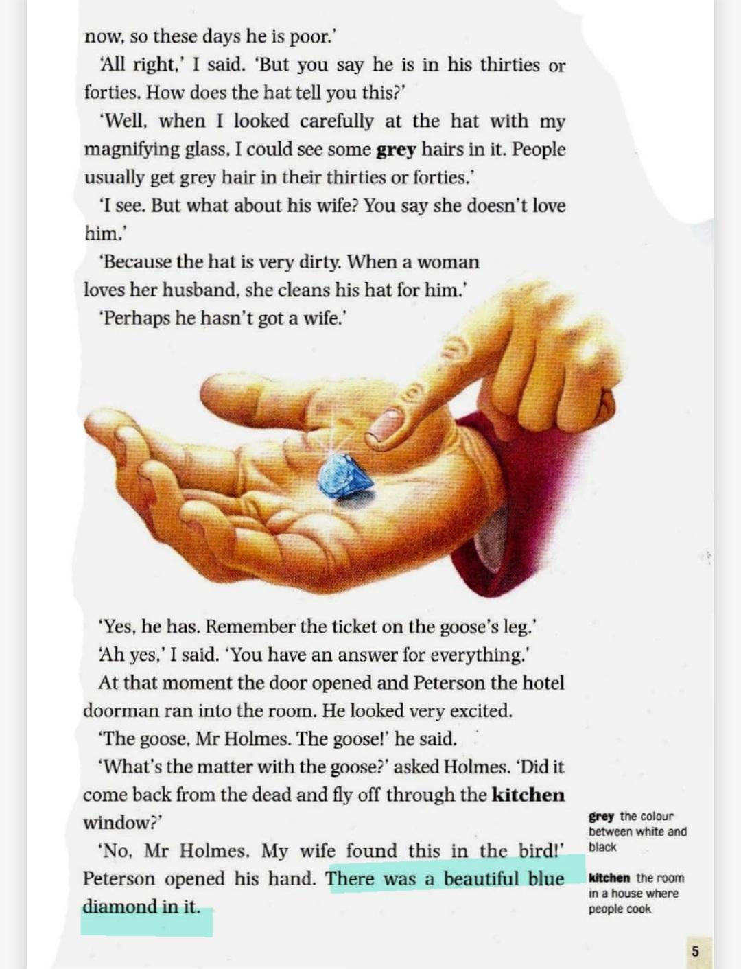 Jac READING CHECK Are these sentences true or false? ties a The story happens in December. b Holmes tells his friend Watson about a tall man with an old hat. c The tall man left a yellow bird in the street. d A hotel doorman - Peterson - gave the hat and the bird to Holmes. e Holmes gave the bird to Watson. f Peterson's wife found a green diamond in the bird. True False