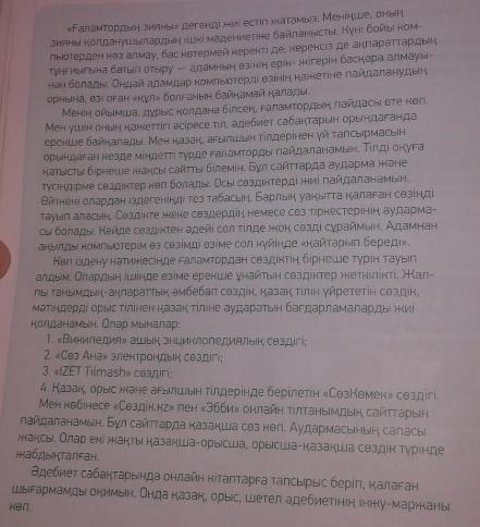 На мой взгляд, если мы можем правильно им пользоваться, Интернет очень полезен. Особенно это заметно, когда я делаю уроки литературы. Я всегда пользуюсь интернетом при выполнении домашних заданий на казахском и английском языках. Я знаю хороший сайт для изучения языков. На этих сайтах много переводов Тусни и Сме сэз. Я часто использую эти чувства. пусть быстро найдет то, что ищет. Пусть ты всегда находишь то чувство, которое хочешь. Sezdik включает в себя перевод слов и фраз. Иногда я намеренно спрашиваю у съезда слово, которого нет в этом языке. Мой компьютер, умнее человека, «возвращает» мне мои чувства в том же состоянии.