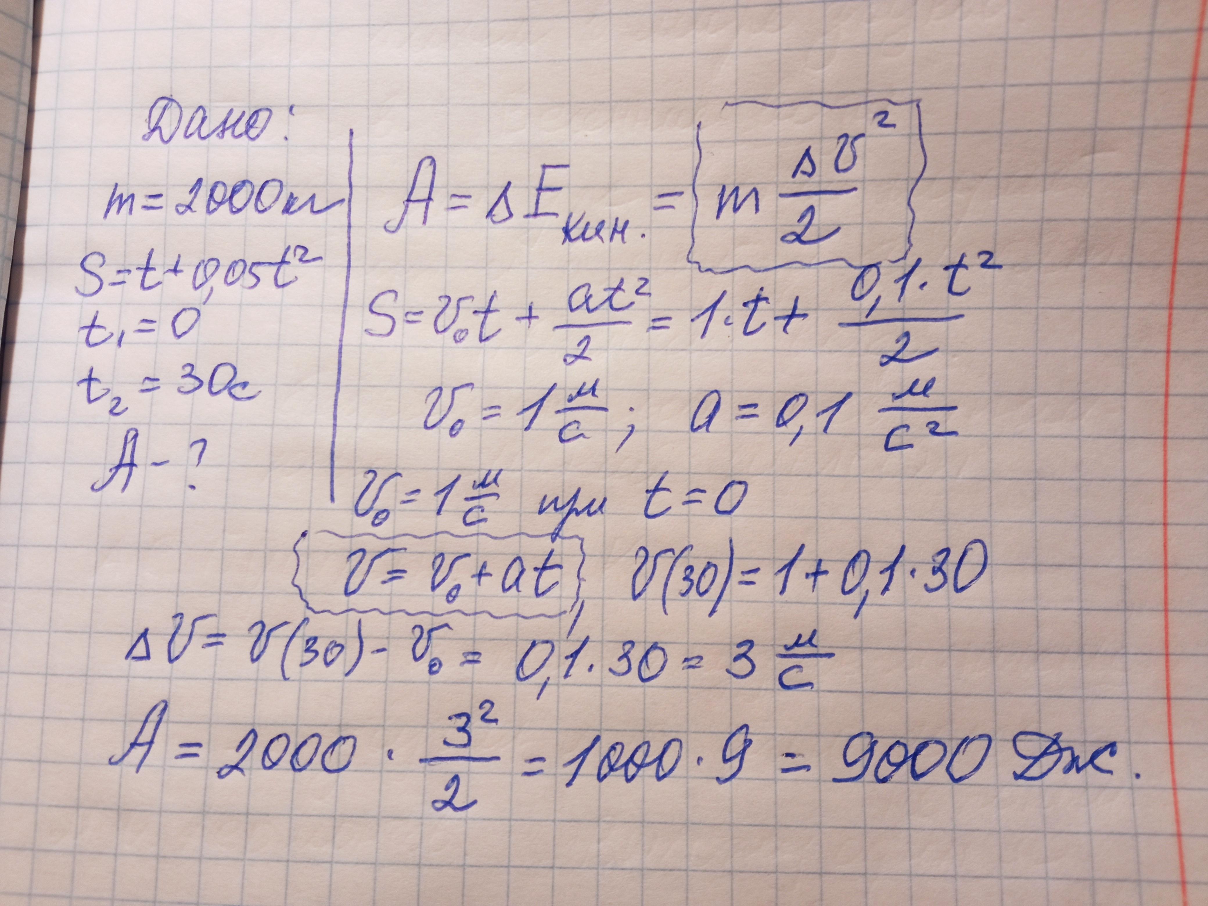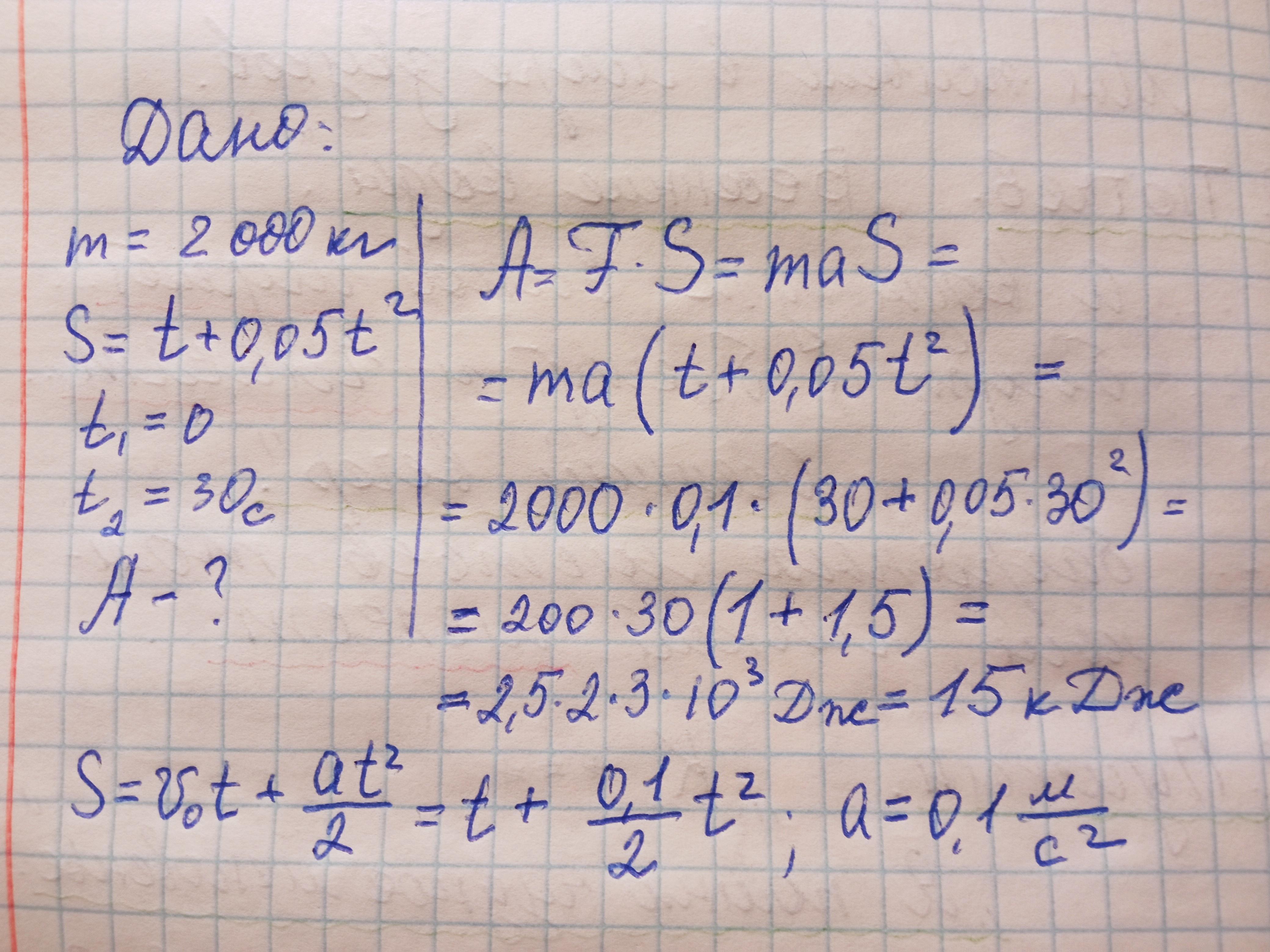 Парусник массой m = 2000 кг движется под действием устоявшейся силы прямолинейно, причем зависимость пройденного пути S от времени t определяется выражением S = Bt + Ct^2, где В = 1 м/с, С = 0,05 м/с2. Определить работу силы ветра за промежуток времени от t1 = 0 до t2 = 30 с
